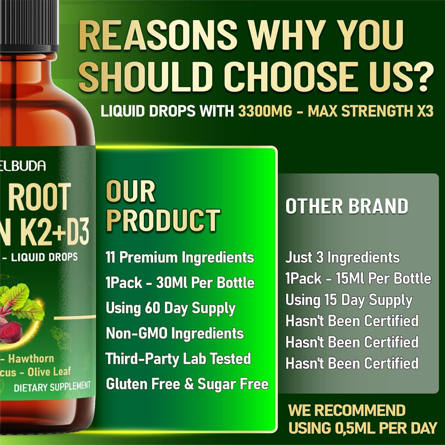 - 🌿 Key Ingredients: Blend of Beet Root, Vitamin D3, K2, Hawthorn Berry Supplement, Cayenne Pepper Drops, Garlic, Hibiscus, Olive, Red Spinach, Green Tea, and Ginseng comprehensive support so your body can absorb new benefits for the new single day