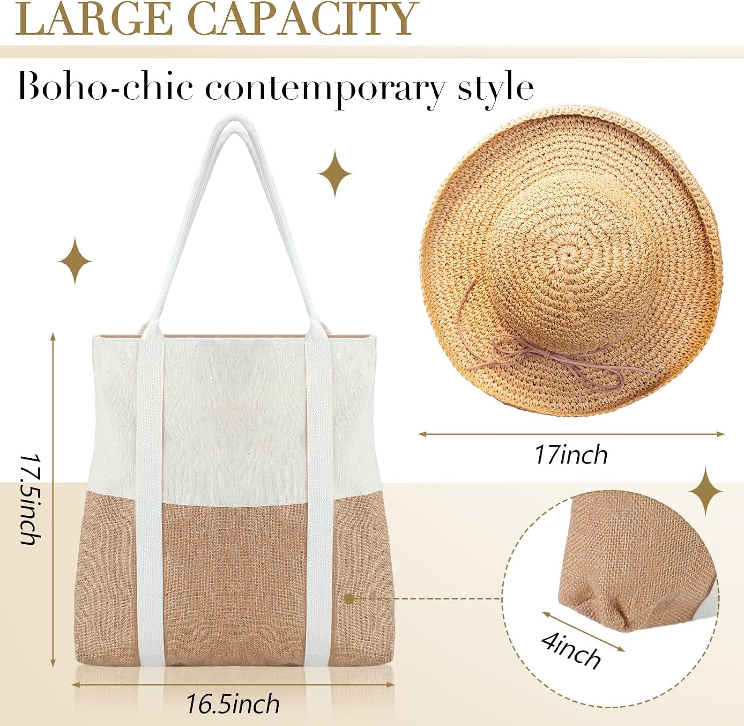 2 Pcs Large Beach Tote Bag Travel Tote Hat Bag for Women with Sun Hat Holder Strap Boho Summer Beach