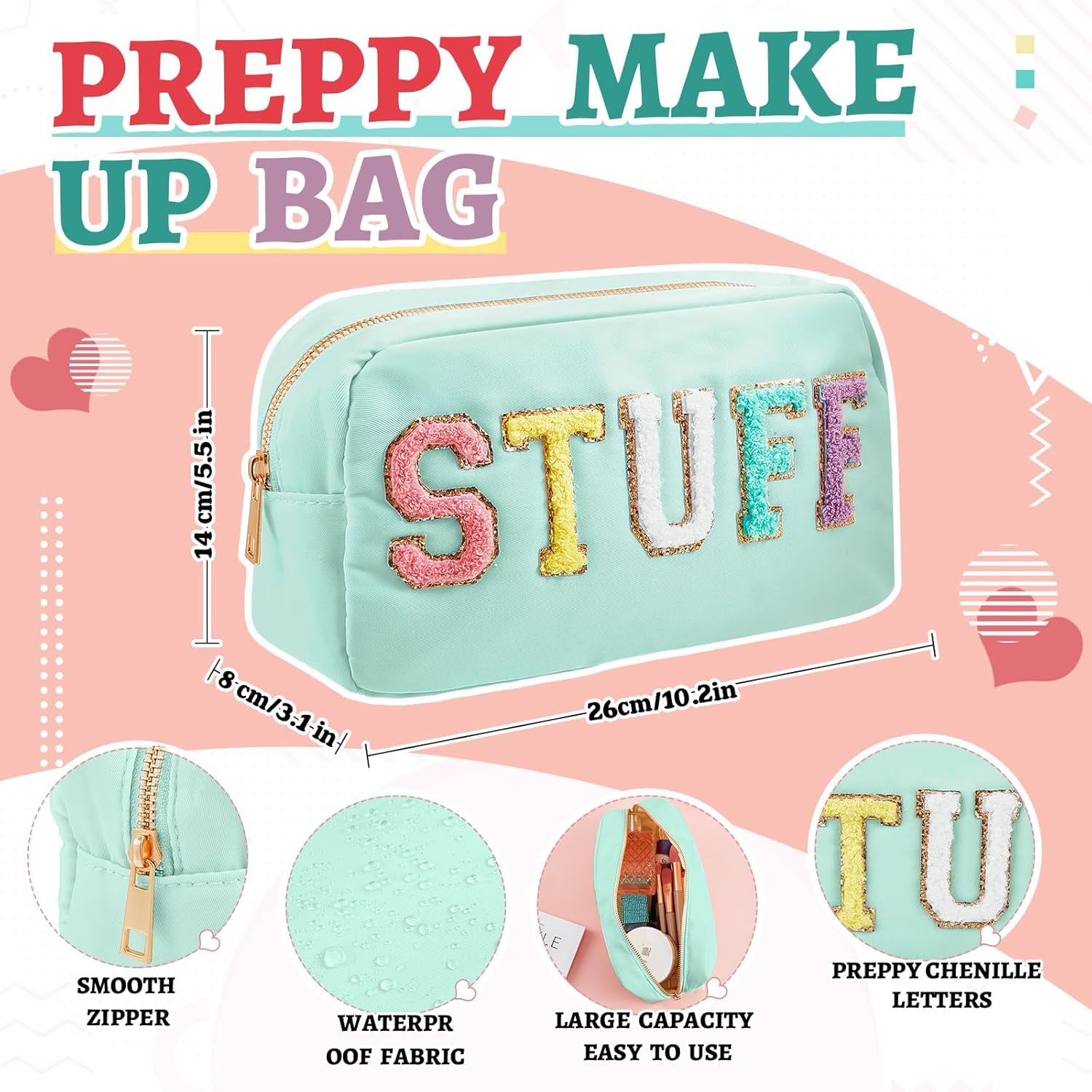 - Abundant Set Package: experience usefulness and style nicely with our abundant 2 pieces set accommodating your needs; This package includes a [TRAVEL] chenille letter preppy duffle bag and a [STUFF] chenille letter makeup organizer pouch; Both made from durable and visually appealing materials, designed to last while maintaining a fashionable appearance even with constant usage