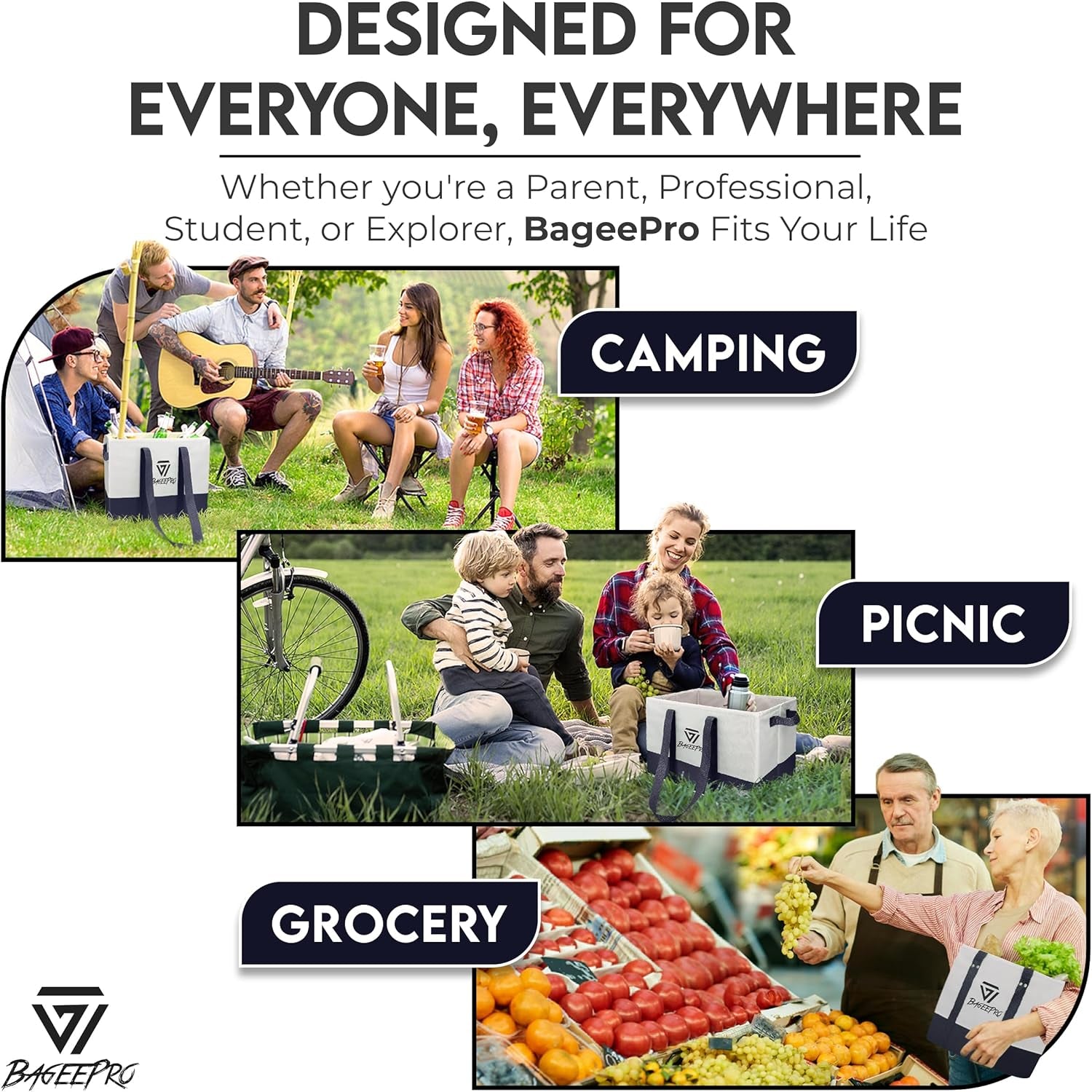 The BageePro reusable grocery bag is designed to bring ease and order to your everyday routine. Whether you're doing a weekly grocery run, organizing your car trunk, or packing for a beach trip, this foldable tote bag adapts to your needs. Its structured design stands upright when filled, with reinforced cardboard panels on all sides and a sturdy base insert to keep items from tipping or collapsing. Measuring 15"" L x 10"" W x 10.5"" H with 12"" long straps, it offers the perfect balance of space, durability, and comfort. Made from premium 600D polyester and 210D water-resistant fabric, it’s built to last and easy to clean with just a quick wipe of a damp cloth.