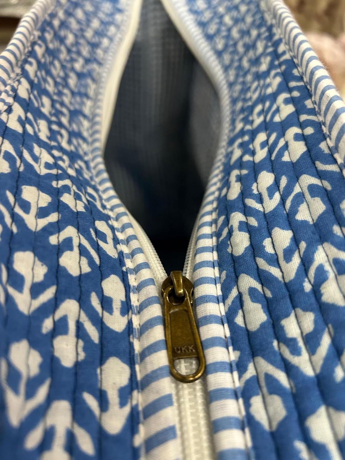 Cotton Quilted Tote Bag, Large Reversible Blue and White Print, Double Handle with Zipper