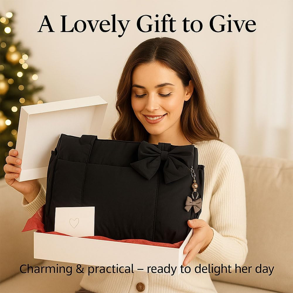 Crush Bow Tote Bag, 26L Foldable Travel Tote for Women with Compartments, Lightweight Shoulder Handbag for Work