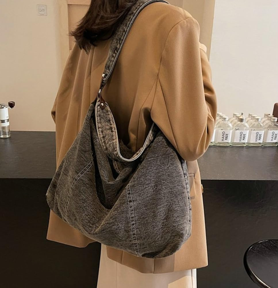 Denim Tote Bag for Women Large Slouchy Canvas Shoulder Bag with 2 Straps Blue Jean Hobo Purse Casual Crossbody Handbag
