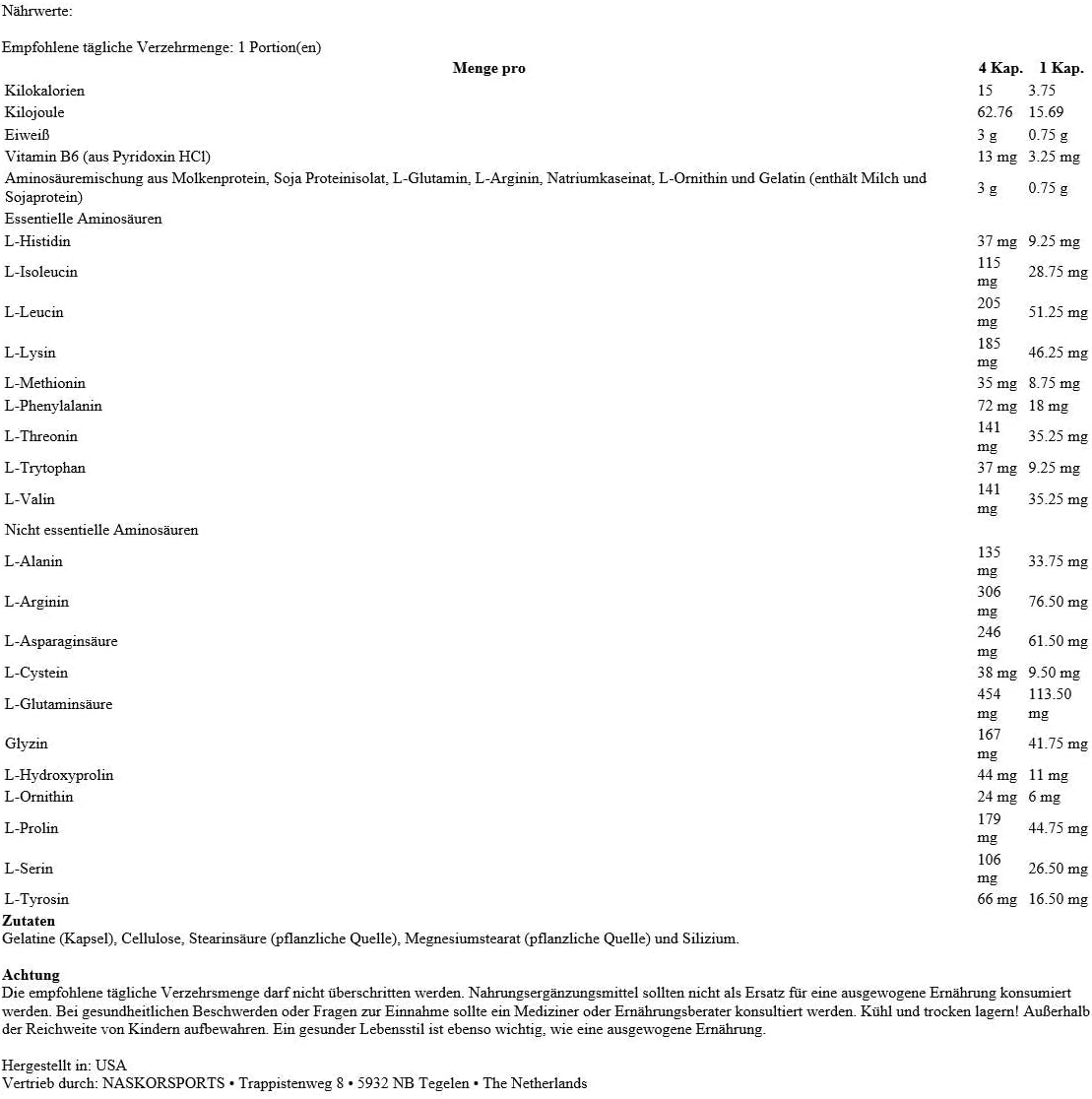 Mezcla equilibrada de Amino Acids. Soporta sano tejido y función enzima. Desempeñar un papel importante en la salud inmunitaria. Amino's son los elementos constitutivos de las proteínas. Crucial para la estructura y función muscular.