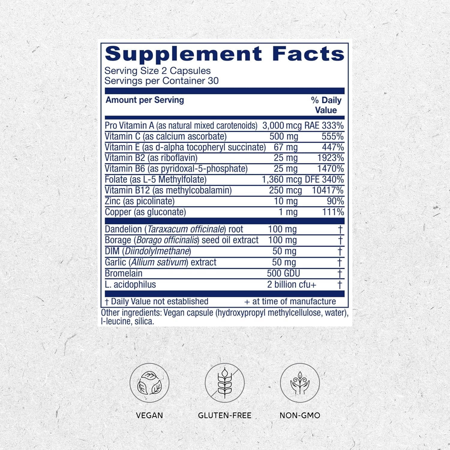 - Other supportive maintenance nutrients: Vitamin E, Borage seed oil (rich in GLA), Beta carotene and Lactobacillus acidophilus*