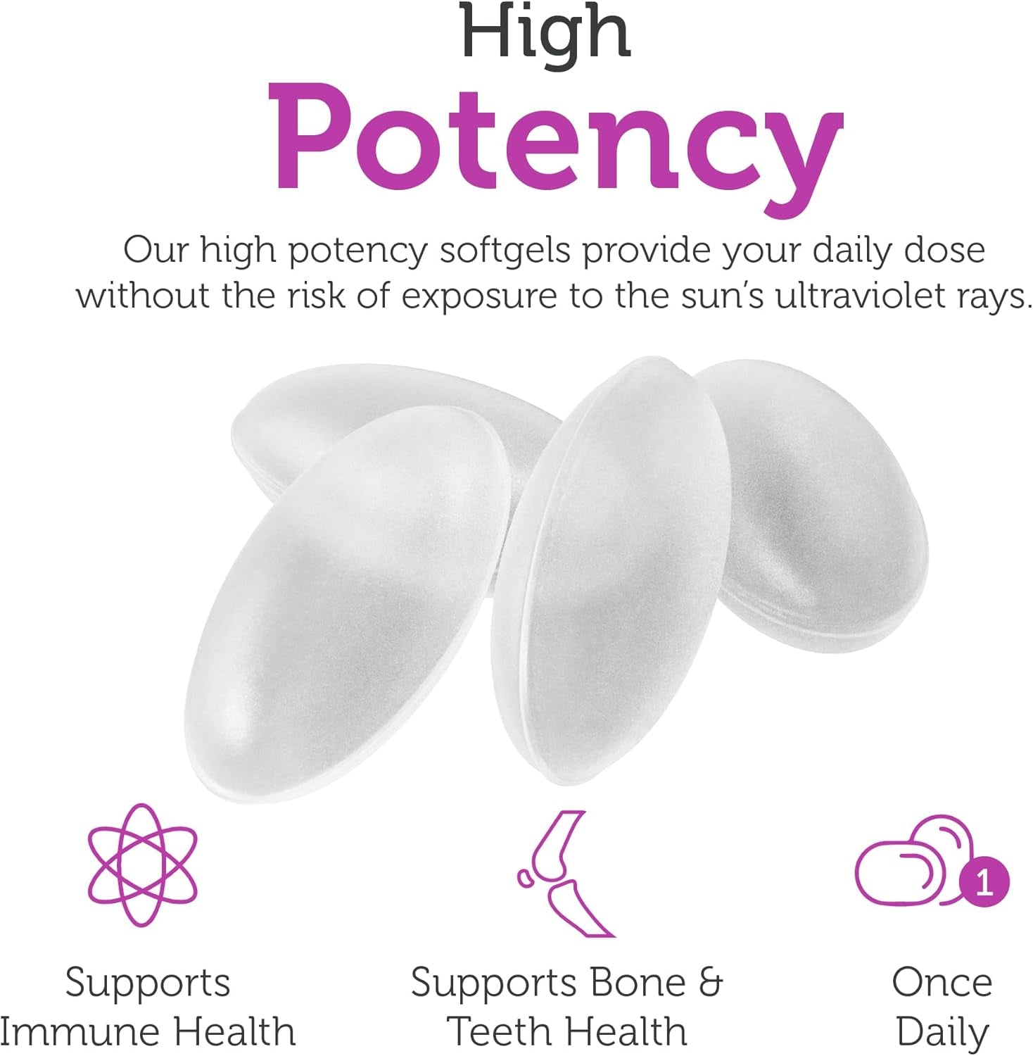 - BONE & TEETH SUPPORT - Vitamin D is an essential vitamin that helps support bone and teeth health in men, women and kids of all ages. Our high potency capsules provide your daily dose without the risk of exposure to the sun's ultraviolet rays.